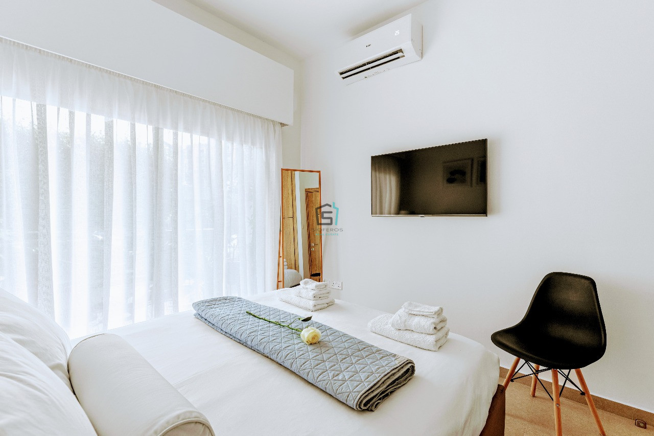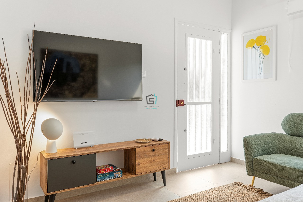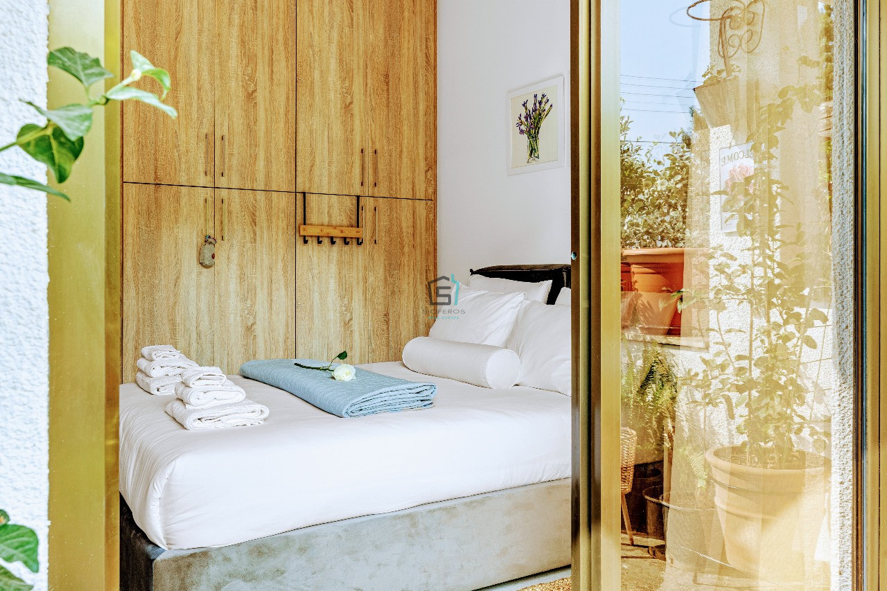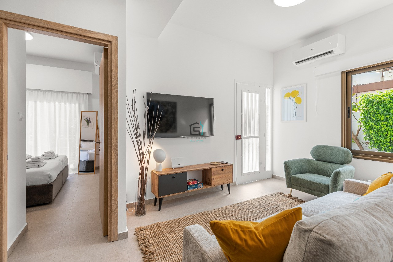 This delightful 1-bedroom ground floor apartment in the sought-after Petrou kai Pavlou area, offers creative living space with a vibrant, welcoming feel. Fully furnished and thoughtfully decorated in cheerful colours, the apartment features 45sqm of comfort, including a bright, open-plan kitchen and living area, fully equipped with all electric appliances, a coffee machine, TV, and air conditioning. The standout feature is the wonderful 30 sqm private veranda.