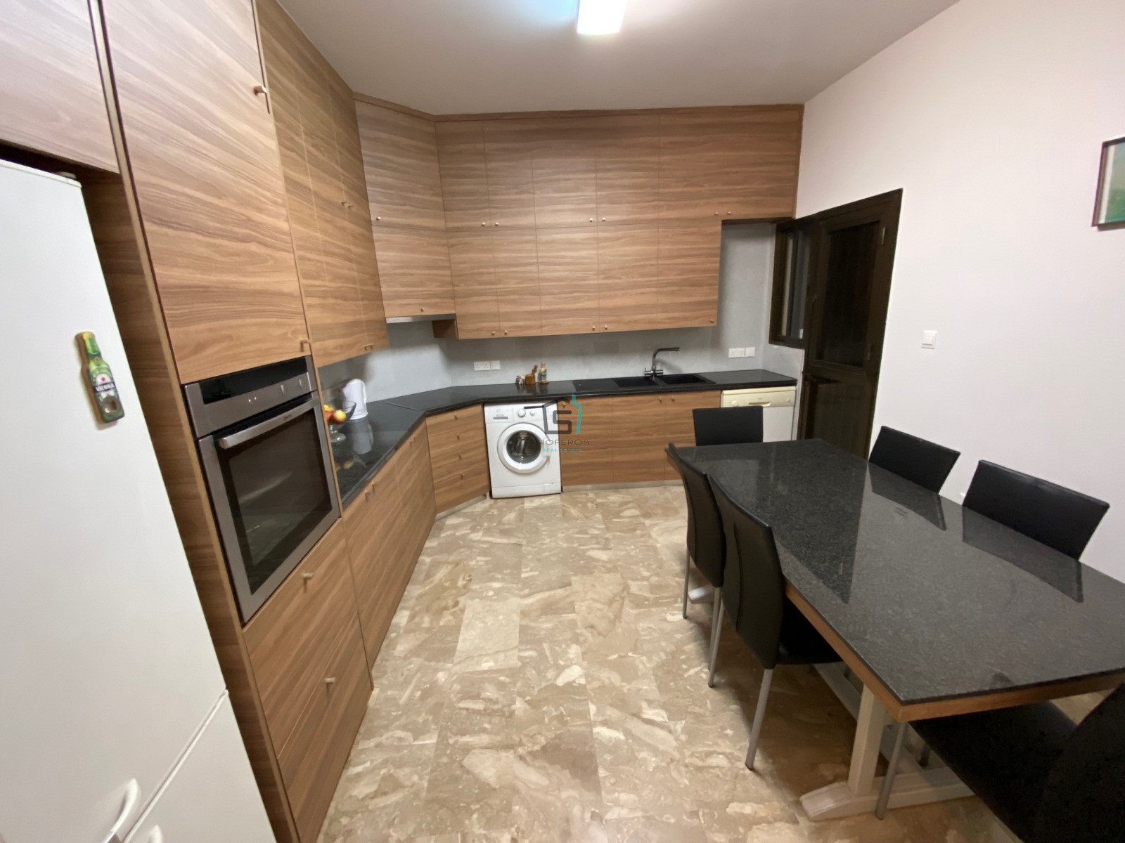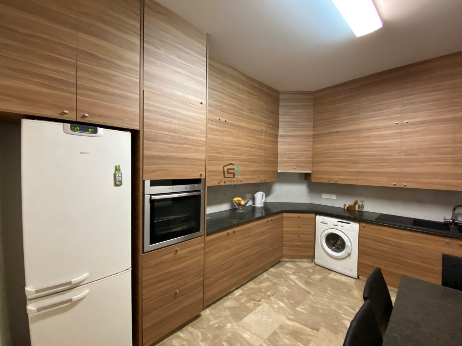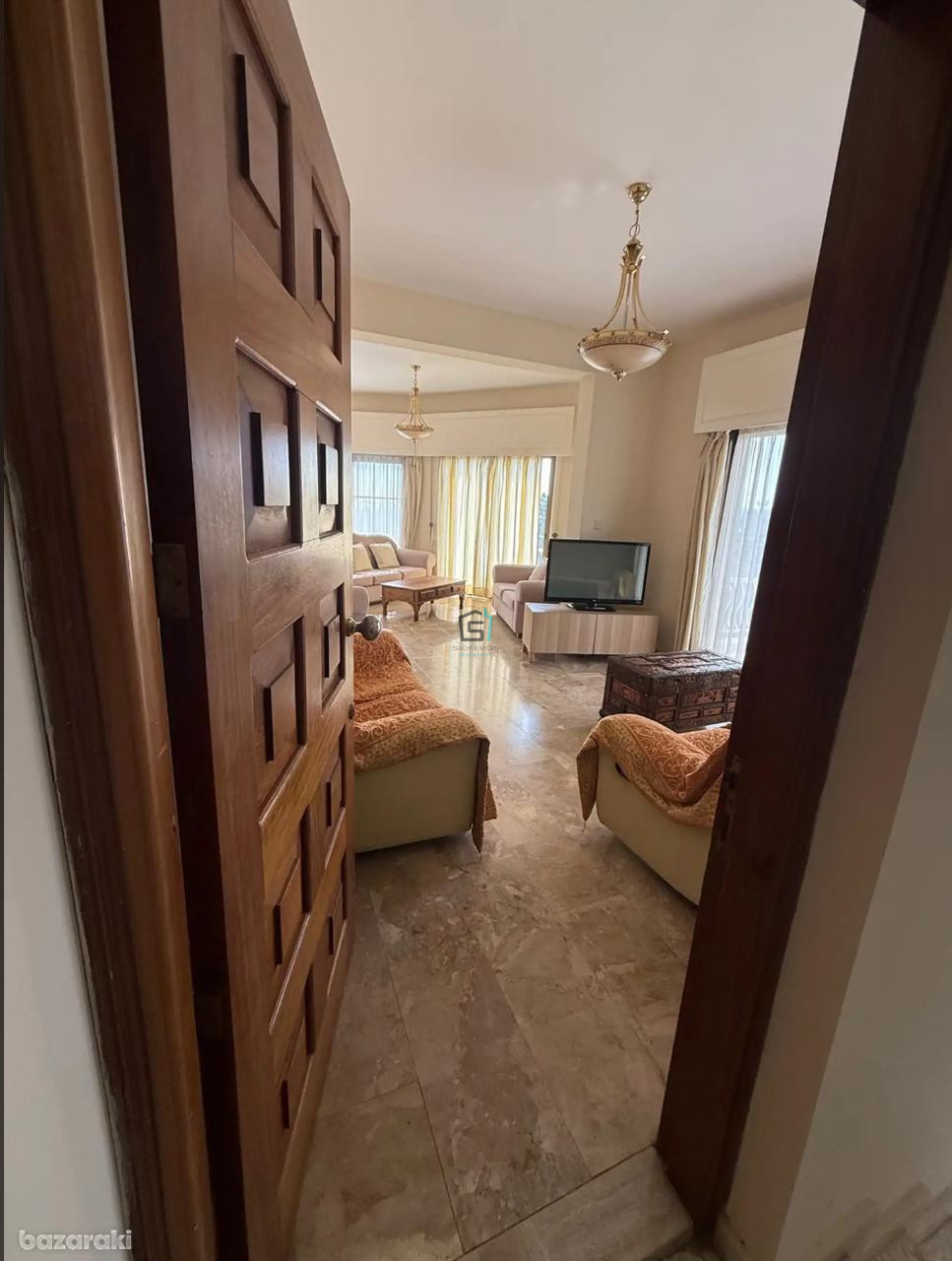 The property offers an open-plan living and dining space, a separate fully equipped kitchen, four covered verandas, a main bathroom and a guest WC. Additional features include central heating, air conditioning, marble flooring, covered parking, and a full set of kitchen appliances.