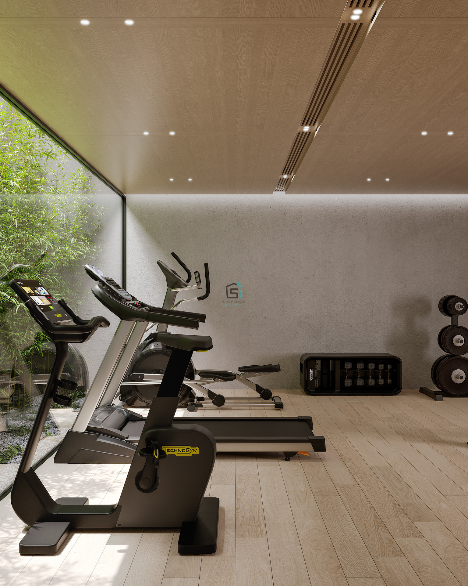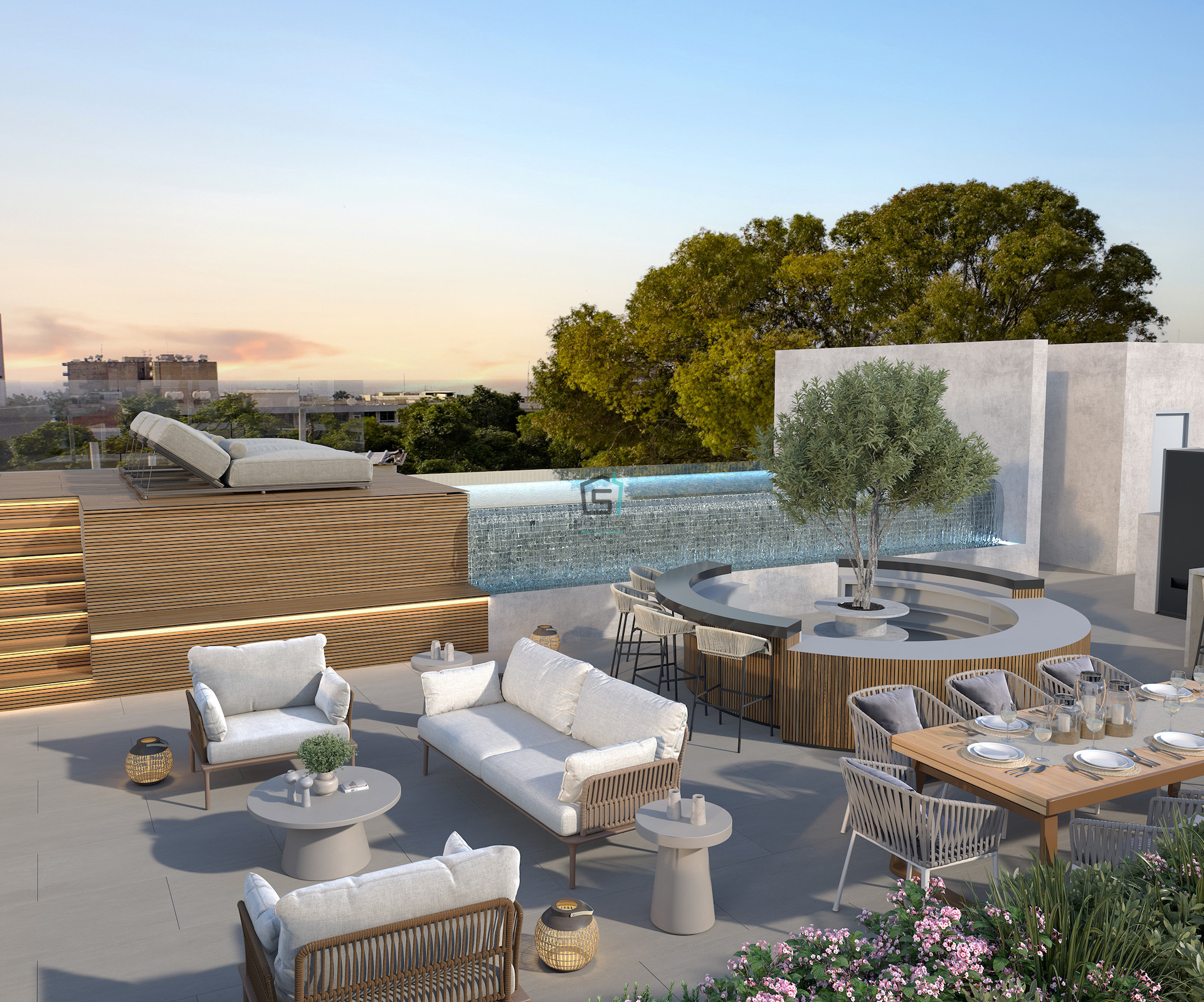 The residential complex features outstanding shared facilities, including an elegant lobby designed for sitting, reading, working, and relaxing of the residents, a rooftop bar, BBQ area, rooftop swimming pool, fully equipped fitness center, landscaped roof garden, and an outdoor cinema wall.