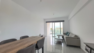 The layout features an open-concept living and dining area which leads on to a large balcony. The kitchen is fully equipped with modern appliances. The property includes two bedrooms, a family bathroom and a guest cloakroom.